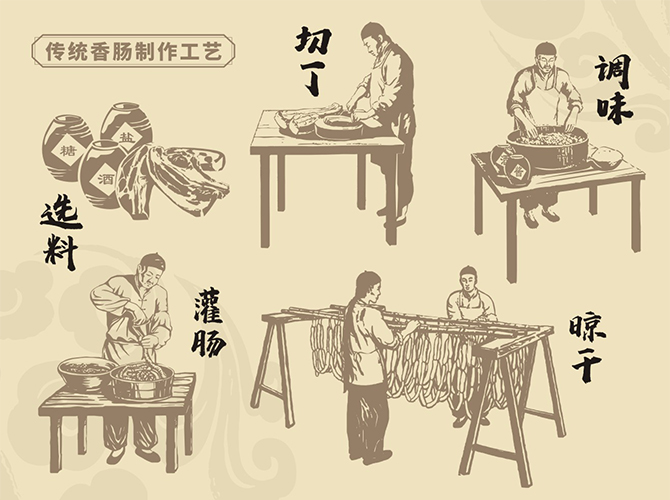 北魏·賈思勰《齊民要術》—灌腸法:“取羊盤腸,凈洗治。細銼羊肉,令如籠肉,細切蔥白、鹽、豉汁、姜、椒末調和,令咸淡適口,以灌腸。兩條夾而炙之。割食甚香美?!边@是有據可查的最早關于香腸工藝的史料記載。
