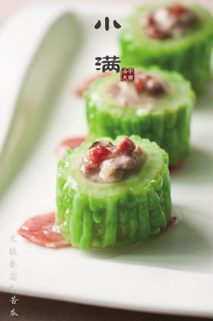 3. 將調(diào)好的餡料塞入苦瓜內(nèi),擺盤,上火隔水蒸8分鐘起鍋即可。